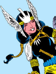 Danielle Moonstar is a mutant who was depowered as a result of M-Day.[44] She was granted a portion of the Valkyries power when Brightwind chose her as his rider,[23] but lost that power and her connection to the Valkyrior when Old Asgard fell.[9] Later Hela restored her Valkyrie powers,[57] then Danielle was exposed to the Transmode Virus,[58] and was subsequently cured by Dark Beast, which resulted in her mutant powers being restored.[59]